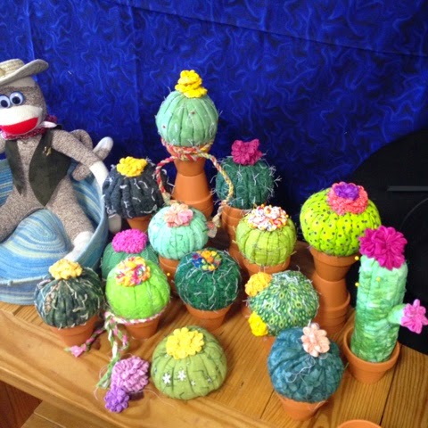 We made cactus pin cushions. We also made clothesline-wrapped bowls and "cowboy rope". I was having too much fun to take pictures. Ok, really, I just didn't even think about it.